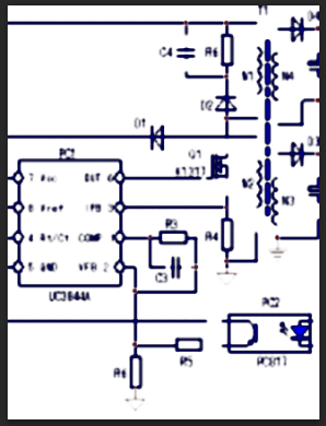 3、保護回路:PC1芯片本身和3腳外圍元件R4構成過流保護回路;N1繞組上并聯的D2、R6、C4元件構成了IGBT的保護電路;實質上穩壓回路的電壓反饋信號——穩壓信號,也可看作是一路電壓保護信號。但保護電路的內容并不僅是局限于保護電路本身,保護電路的起控往往是由于負載電路的異常所引起。