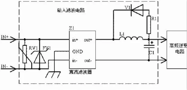 如圖所示,FV1為瞬態電壓抑制二極管,RV1為壓敏電阻,都具有很強的瞬變浪涌電流的吸收能力,能很好的保護后級元件或電路免遭浪涌電壓的破壞。Z1為直流EMI濾波器,必須良好接地,接地線要短,最好直接安裝在金屬外殼上,還要保證其輸入、輸出線之間的屏蔽隔離,才能有效的切斷傳導干擾沿輸入線的傳播和輻射干擾沿空間的傳播。L1、C1組成低通濾波電路,當L1電感值較大時,還需增加如圖所示的V1和R1元件,形成續流回路吸收L1斷開時釋放的電場能,否則L1產生的電壓尖峰就會形成電磁干擾,電感L1所使用的磁芯最好為閉合磁芯,帶氣隙的開環磁芯的漏磁場會形成電磁干擾,C1的容量較大為好,這樣可以減小輸入線上的紋波電壓,從而減小輸入導線周圍形成的電磁場。點擊進入看圖評論DC/DC變換器輸入濾波電路2.高頻逆變電路的電磁兼容設計,如圖所示,C2、C3、V2、V3組成的半橋逆變電路,V2、V3為IGBT、MOSFET等開關元件,在V2、 V3開通和關斷時,由于開關時間很快以及引線電感、變壓器漏感的存在,回路會產生較高的di/dt、dv/dt突變,從而形成電磁干擾,為此在變壓器原邊 兩端增加R4、C4構成的吸收回路,或在V2、V3兩端分別并聯電容器C5、C6,并縮短引線,減小ab、cd、gh、ef的引線電感。在設計中,C4、 C5、C6一般采用低感電容,電容器容量的大小取決于引線電感量、回路中電流值以及允許的過沖電壓值的大小,LI2/2=C△V2/2公式求得C的大小, 其中L為回路電感,I為回路電流,△V為過沖電壓值。