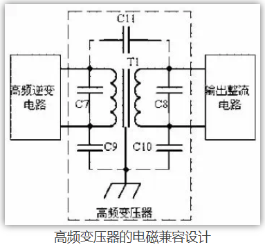 如圖所示,C7、C8為匝間耦合電路,C11為繞組間耦合電容,在變壓器繞制時,盡量減小分布電容C11,以減小變壓器原邊的高頻干擾耦合到次邊繞組。 另外為進一步減小電磁干擾,可在原、次邊繞組間增加一個屏蔽層,屏蔽層良好接地,這樣變壓器原、次邊繞組對屏蔽層間就形成耦合電容C9、C10,高頻干擾 電流就通過C9、C10流到大地。
