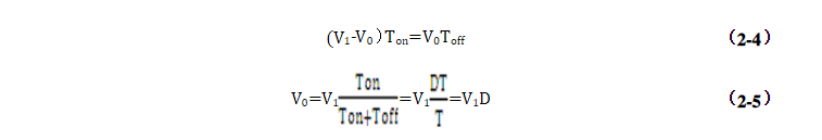 現(xiàn)在來講講開關(guān)電源的電路工作原理:Boost電路即升壓電路,當(dāng)Q1導(dǎo)通時(shí),能量從輸入電源流入儲(chǔ)存于電感L1中,此刻二極管D1反偏,負(fù)載由濾波電容C1供給能量,將C1中儲(chǔ)存的電能(C1V02/2)釋放給負(fù)載R1。當(dāng)Q1截止時(shí),電感L1中電流不能突變,此刻二極管D1導(dǎo)通,電感中儲(chǔ)存的能量(L1I2/2)經(jīng)二極管D1,流入電容C1,并供給負(fù)載R1。依據(jù)電感的伏秒平衡,在一個(gè)周期內(nèi)電感的伏秒乘積和為零。如果Q1導(dǎo)通時(shí)間Ton越大,那么Q1截止時(shí)提供給負(fù)載的電壓就會(huì)越大。下面通過具體的計(jì)算來加深了解:根據(jù)伏秒平衡有式(2-2)、(2-3)