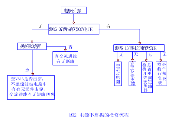 這種狀況說明電源不啟振,可按圖2所示的流程進行檢修。