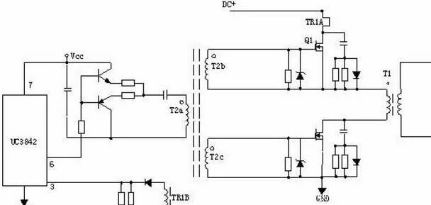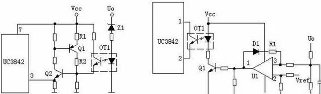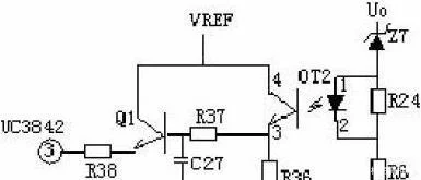 輸出限壓維護電路:輸出限壓維護電路如下圖,當輸出電壓升高,穩壓管導通光耦導通,Q1基極有驅動電壓而道通,UC3842③電壓升高,輸出下降,穩壓管不導通,UC3842③電壓下降,輸出電壓升高。循環往復,輸出電壓將安穩在一范圍內(取決于穩壓管的穩壓值)。