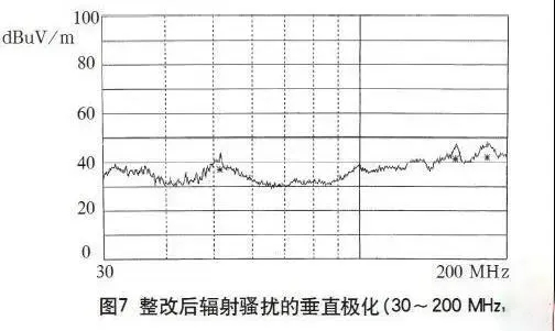 并且為了減少因變壓器側注冊時電流瞬間驟變發生的di/dt攪擾,在變壓器T1的 側串進1個電感,以減小器材的注冊損耗,下降輻射攪擾信號。通過整改后,輻射攪擾大大下降,再次對本電源輻射攪擾進行測驗,徹底達到了規范要求,其測驗成果如圖7所示。