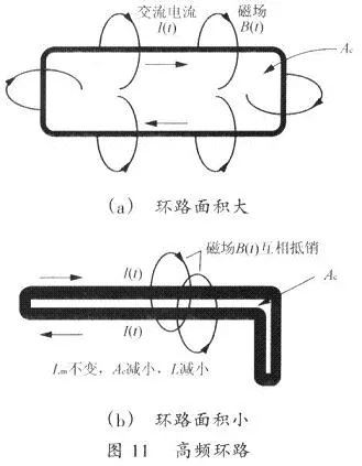 1.4高頻環路開關電源中有許多由功率器件所組成的高頻環路,假設對這△環路處嬋得欠好的話,就會對電源的正常作業構成很大影響。為了減小高頻環路所產生的電磁波噪音,該環路的面積應該控制得非常小。如圖l1(a)所示,高頻電流環路面積很大,就會在環路的內部和外部產生很強的電磁于擾。同樣的高頻電流,當環路面積規劃得非常小時,如圖11(b)所示,環路內部和外部電磁場相互抵消,整個電路會變得非常安靜。