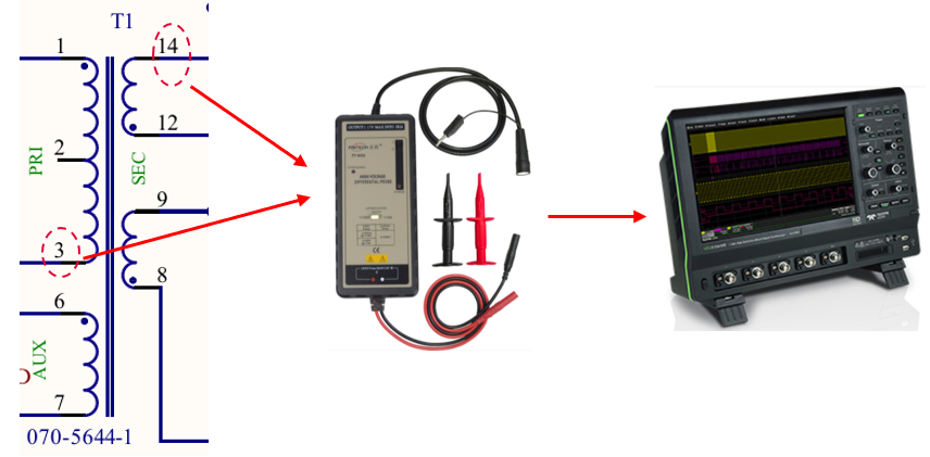 回到本文的重點,接下來測試一次側(cè)高壓端與SELV電路之間的重復(fù)峰值電壓是否超過750V閾值電壓。有經(jīng)驗的同學(xué)都知道,在開關(guān)電源中,重點是要找到變換器中的“動點”,也就是電壓的變化率dv/dt最大的節(jié)點,在圖5中,一次側(cè)高壓端的監(jiān)測點就可以選為Q1的Drain極,也就是變壓器T1的pin 3,安全二次側(cè)SELV的監(jiān)測點既可以選擇變壓器T1的pin 12,也可以選擇變壓器T1的pin 14,最后以正常帶載工況下一次側(cè)、二次側(cè)之間檢測到最大電壓為作為設(shè)定局部放電電壓UPD的基準。