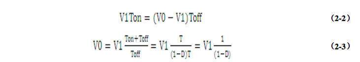 現(xiàn)在來(lái)講講電路的工作原理:?Boost電路即升壓電路,當(dāng)Q1導(dǎo)通時(shí),能量從輸入電源流入儲(chǔ)存于電感L1中,此時(shí)二極管D1反偏,負(fù)載由濾波電容C1供給能量,將C1中儲(chǔ)存的電能(C1V02/2)釋放給負(fù)載R1。當(dāng)Q1截止時(shí),電感L1中電流不能突變,此時(shí)二極管D1導(dǎo)通,電感中儲(chǔ)存的能量(L1I2/2)經(jīng)二極管D1,流入電容C1,并供給負(fù)載R1。?根據(jù)電感的伏秒平衡,在一個(gè)周期內(nèi)電感的伏秒乘積和為零。如果Q1導(dǎo)通時(shí)間Ton越大,那么Q1截止時(shí)提供給負(fù)載的電壓就會(huì)越大。下面通過(guò)具體的計(jì)算來(lái)加深理解:?????根據(jù)伏秒平衡有式(2-2)、(2-3)