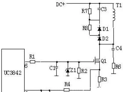 R4、C3、R5、R6、C4、D1、D2組成緩沖器,和開關(guān)電源MOS管并接,使開關(guān)電源管電壓應(yīng)力削減,EMI削減,不發(fā)生二次擊穿。在開關(guān)電源電源管Q1關(guān)斷時(shí),變壓器的原邊線圈易發(fā)生尖峰電壓和尖峰電流,這些元件組合一同,能很好地吸收尖峰電壓和電流。從R3測得的電流峰值信號(hào)參加當(dāng)前工作周波的占空比操控,因此是當(dāng)前工作周波的電流約束。當(dāng)R5上的電壓到達(dá)1V時(shí),UC3842停止工作,開關(guān)電源電源管Q1當(dāng)即關(guān)斷 。 R1和Q1中的結(jié)電容CGS、CGD一同組成RC網(wǎng)絡(luò),電容的充放電直接影響著開關(guān)電源管的開關(guān)電源電源速度。R1過小,易引起振動(dòng),電磁干擾也會(huì)很大;R1過大,會(huì)降低開關(guān)電源管的開關(guān)電源速度。Z1通常將MOS管的GS電壓約束在18V以下,然后保護(hù)了MOS管。
